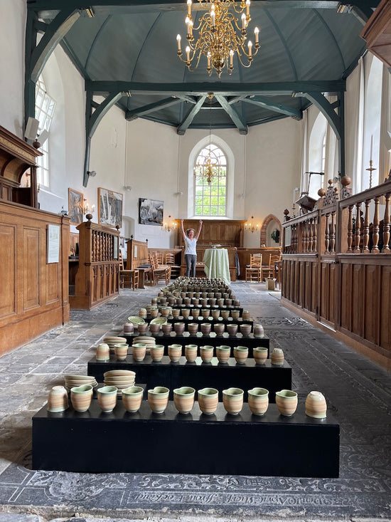Vandaag was de opening van het Elfstedenproject van Dineke Taal, een keramist. Of ik mee wilde helpen? Mensen welkom heten en lekkernijen uit de Friese elfsteden presenteren. Dineke Taal heeft een 11 steden servies gemaakt. Dus mijn hangemaakte tas goed beschermd in de fietstas en go go go.