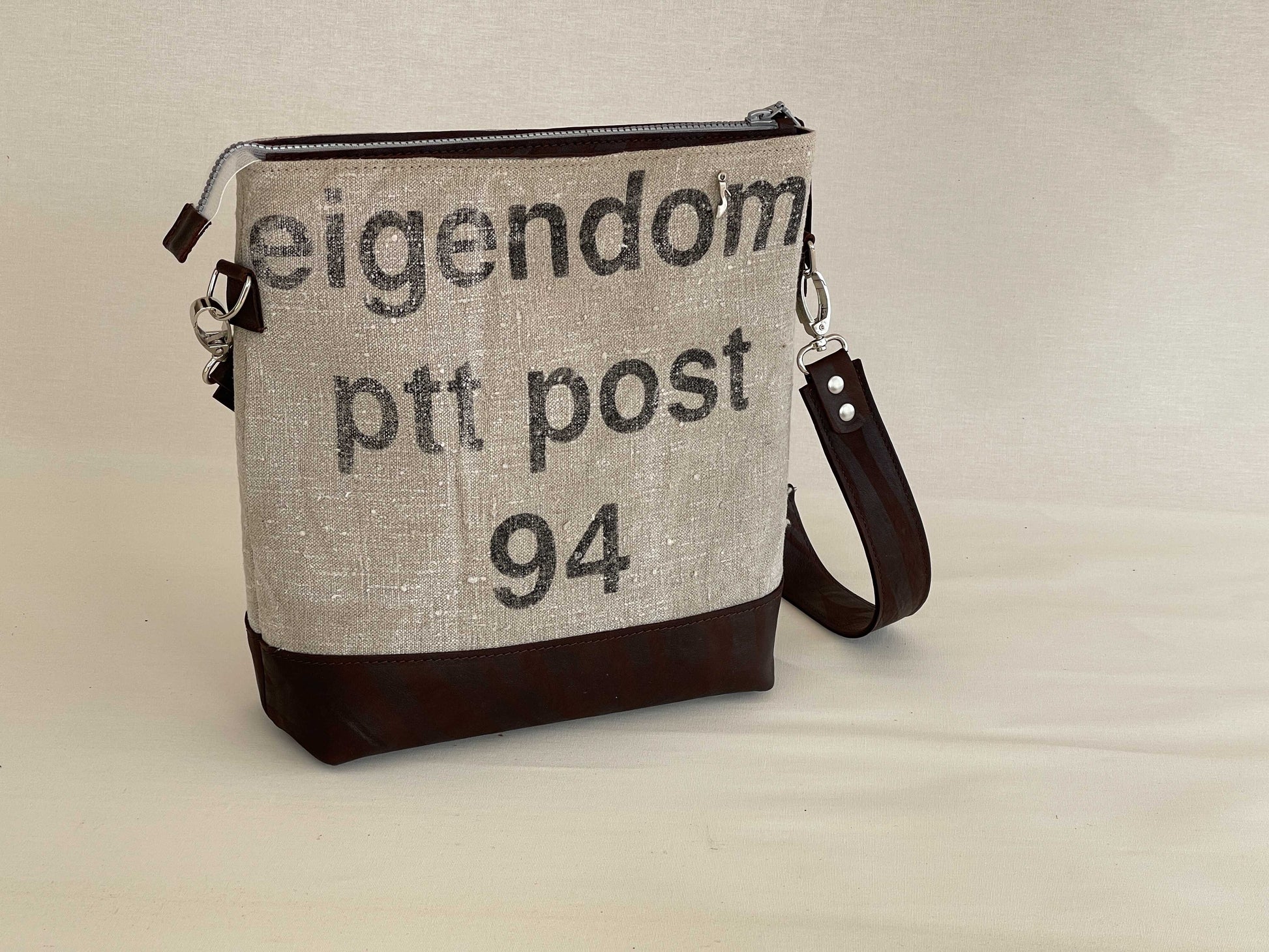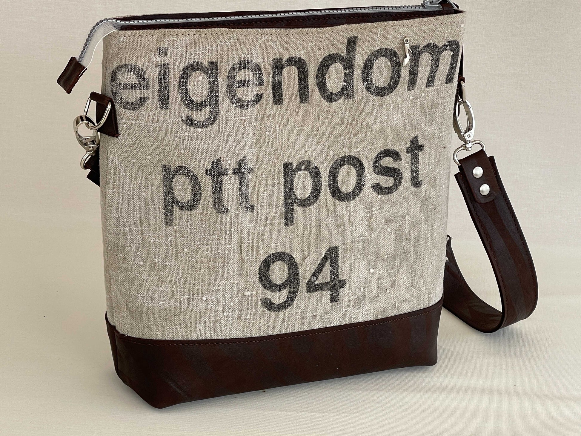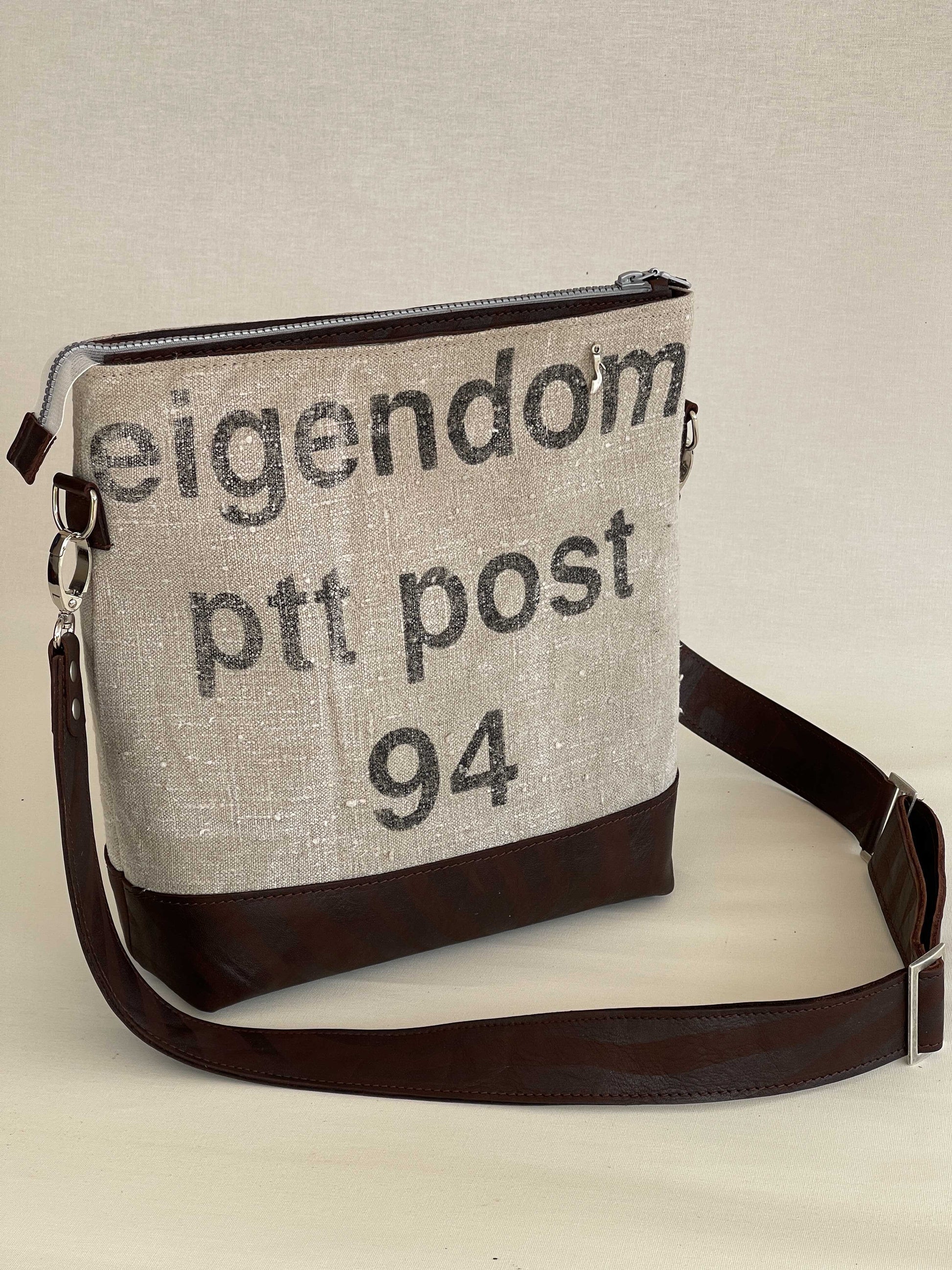 Een originele unieke canvas postzak heb ik verwerkt in deze tas. Deze bereisde zakken zouden worden weggegooid of ik ze kon gebruiken? Deze tas is gecombineerd met donker rundleer. Het leren vak is een knipoog naar de brievenbus en is lekker robuust uitgevoerd evenals de brede schouderband. Klaar voor de wereld en nieuwe avonturen....