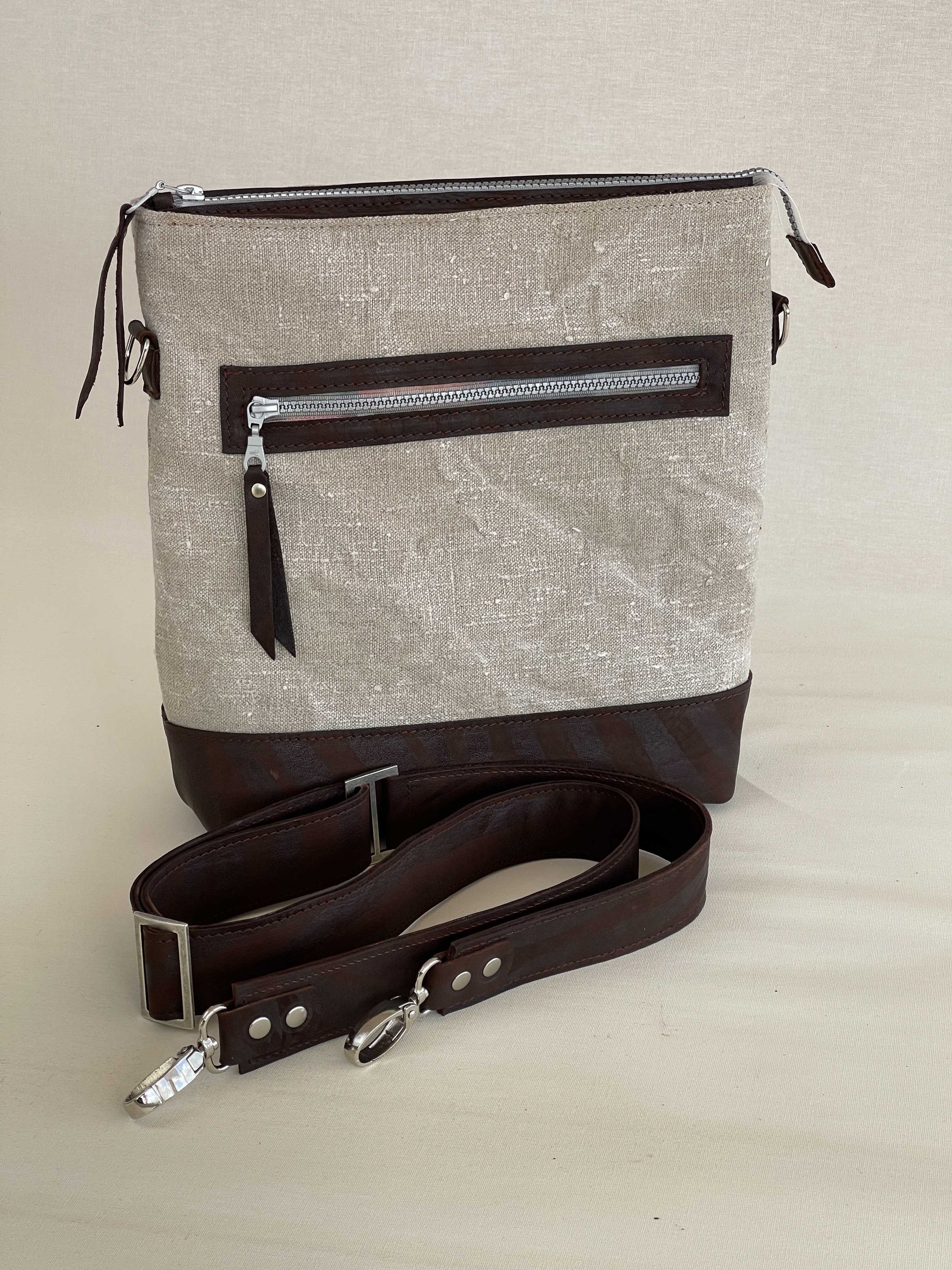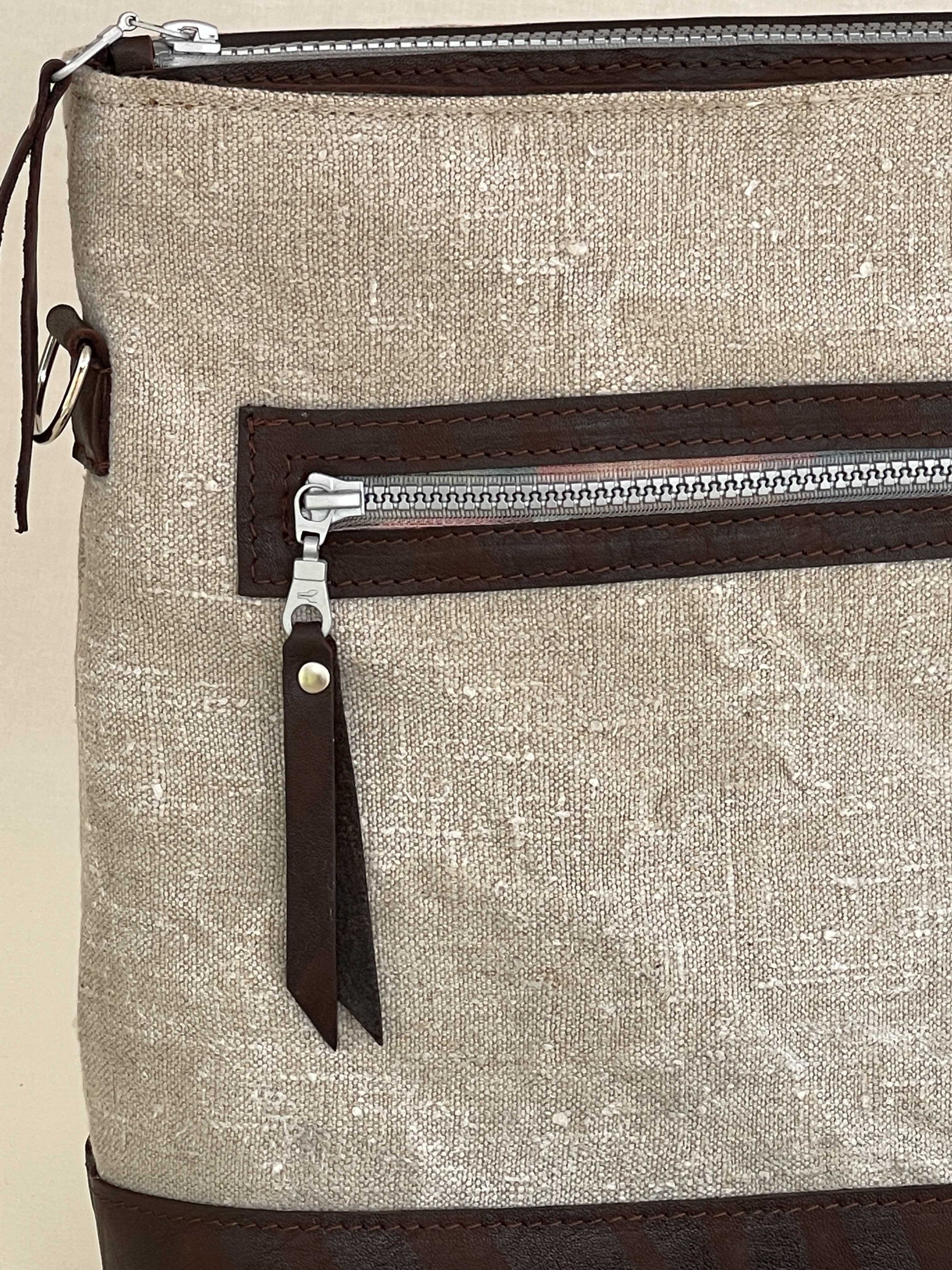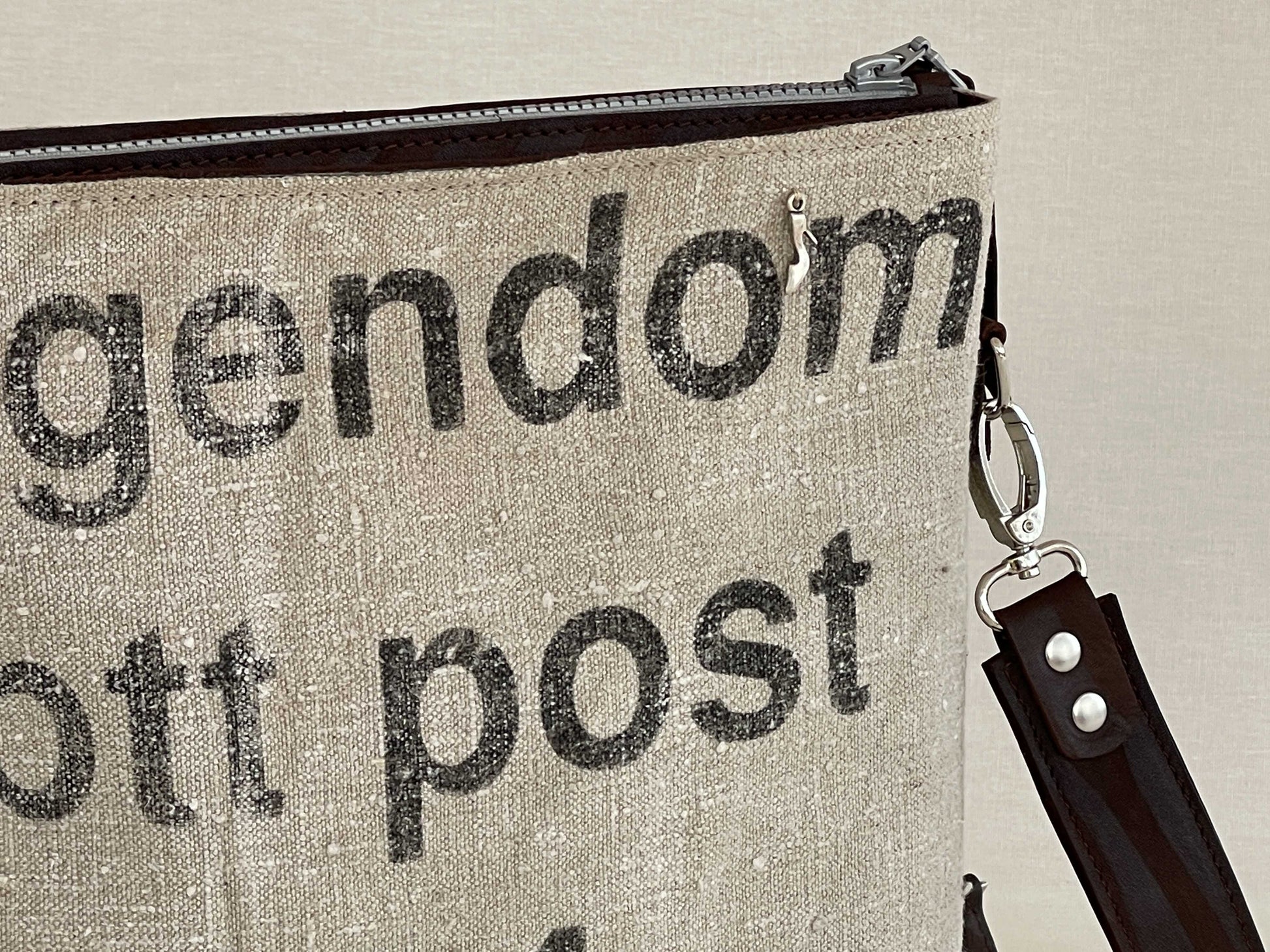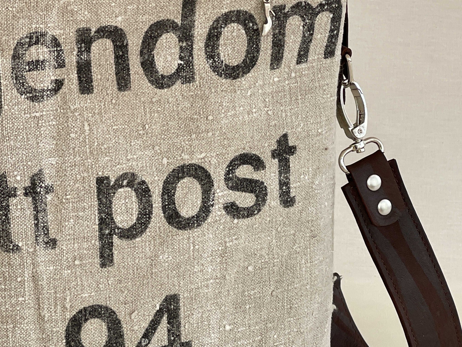 Een originele unieke canvas postzak heb ik verwerkt in deze tas. Deze bereisde zakken zouden worden weggegooid of ik ze kon gebruiken? Deze tas is gecombineerd met donker rundleer. Het leren vak is een knipoog naar de brievenbus en is lekker robuust uitgevoerd evenals de brede schouderband. Klaar voor de wereld en nieuwe avonturen....
