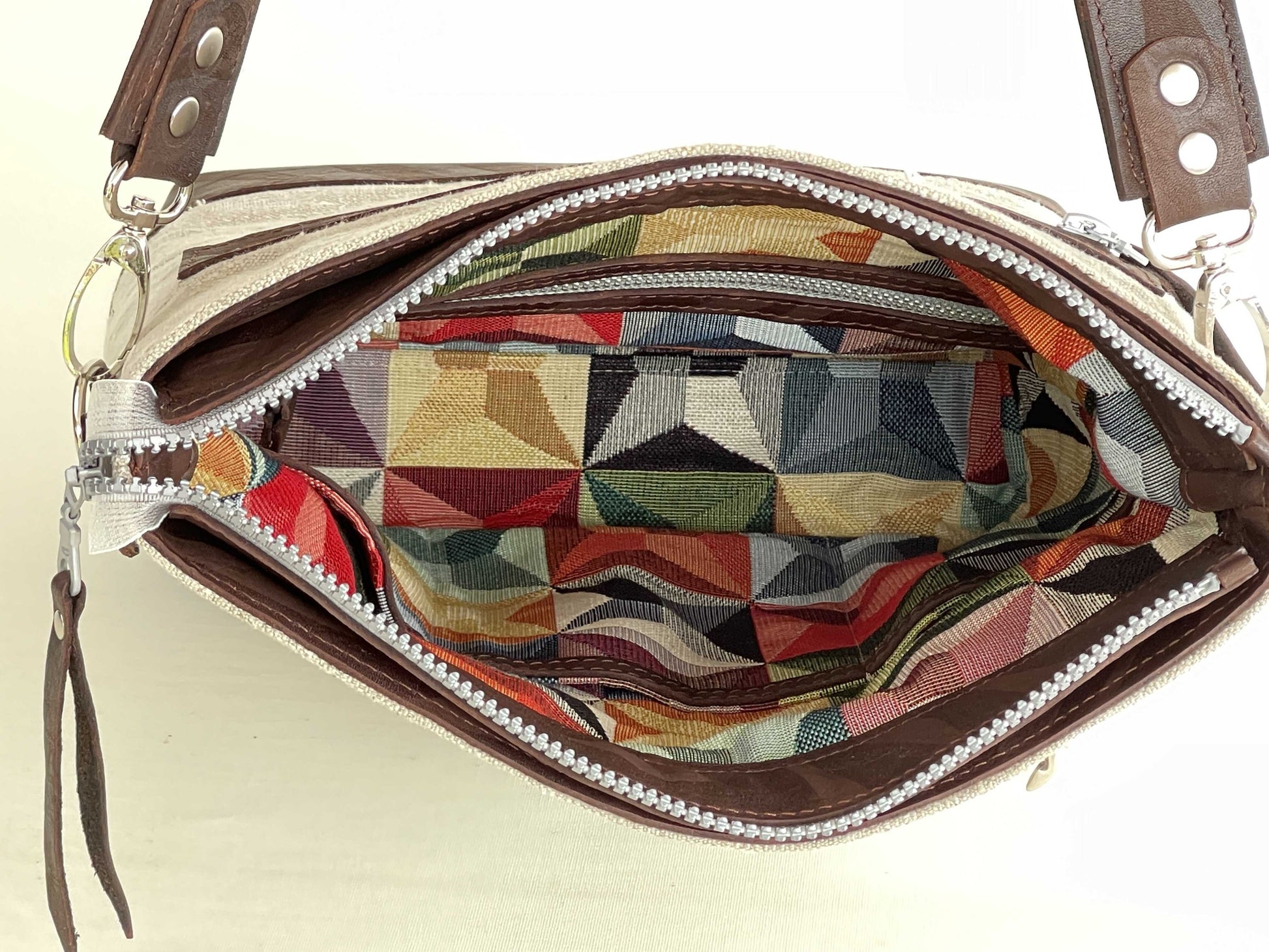 De binnentas is gevoerd met een verrassend gekleurde gobelin.