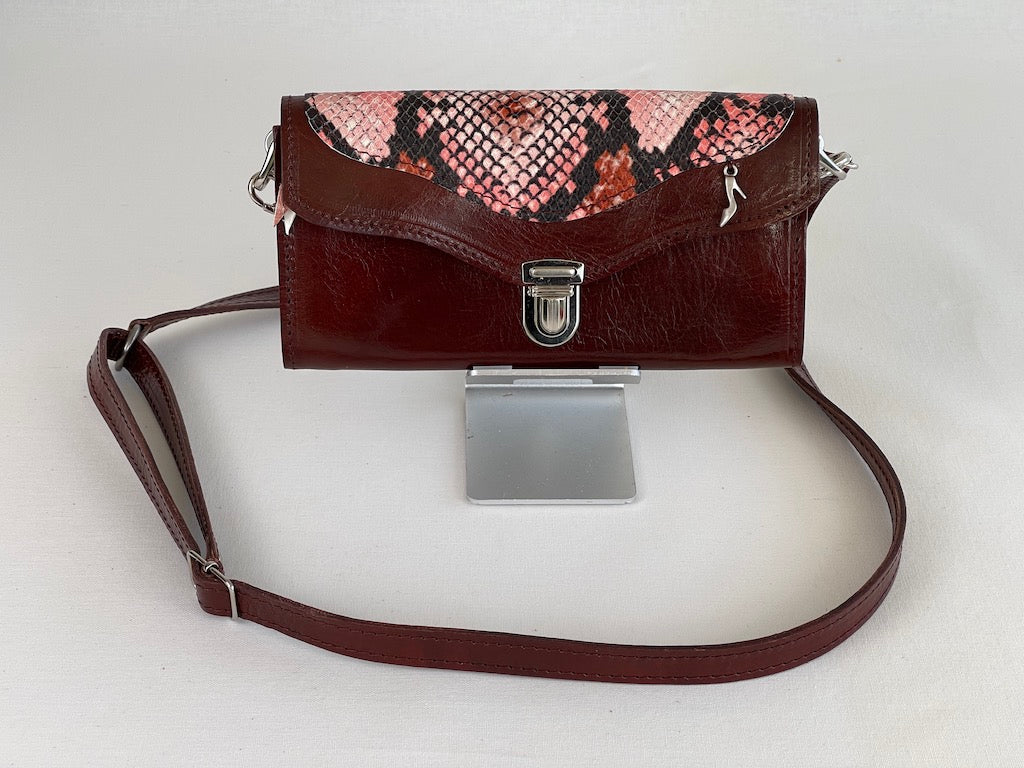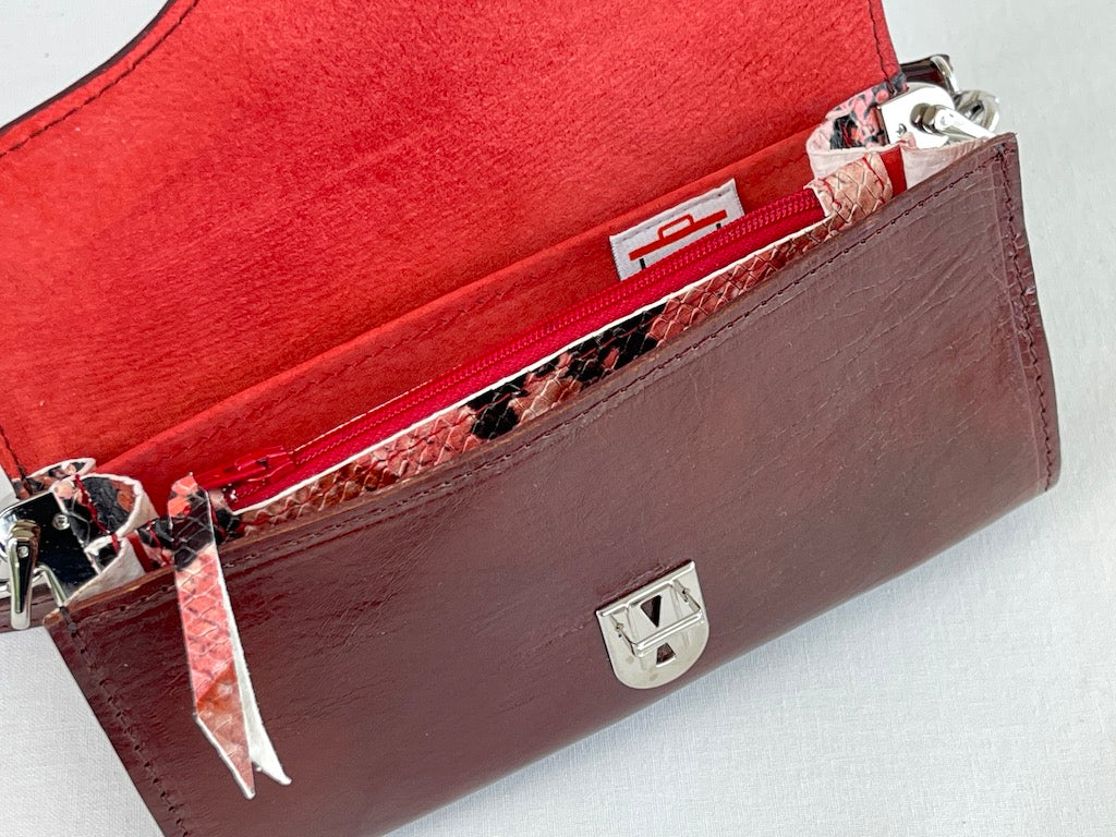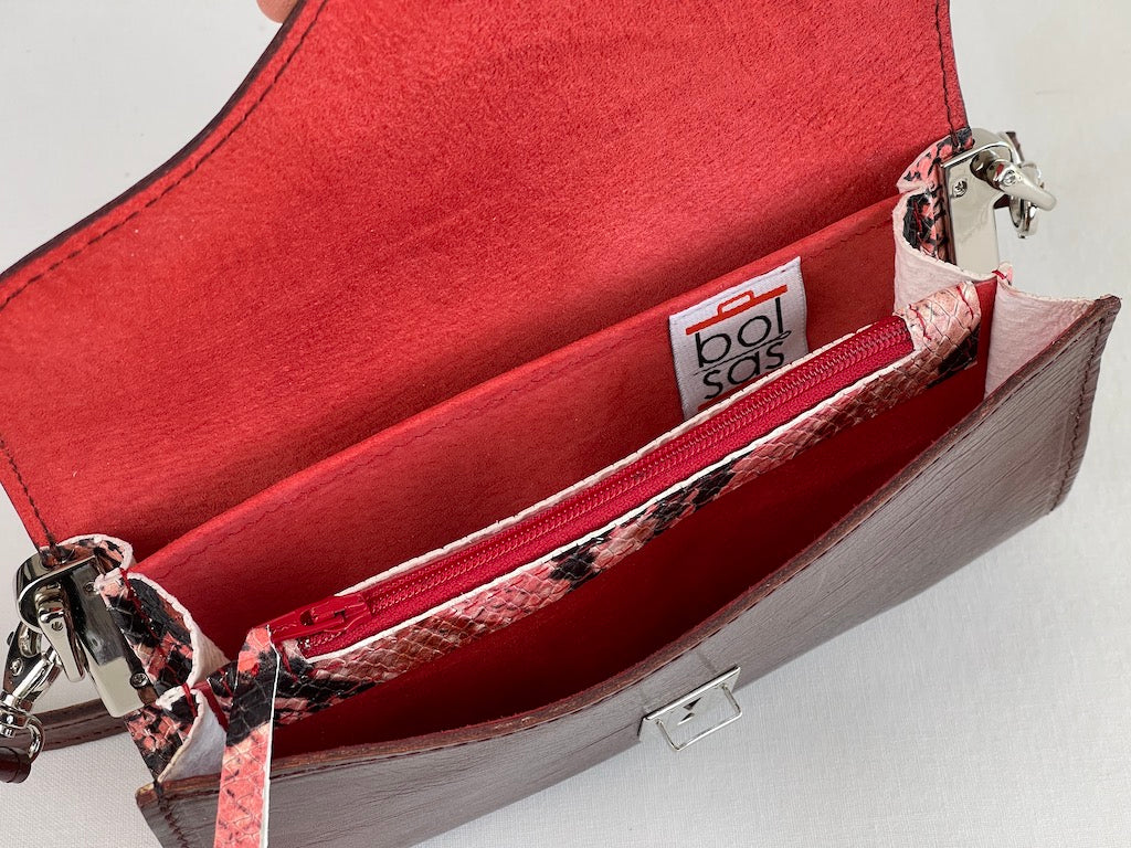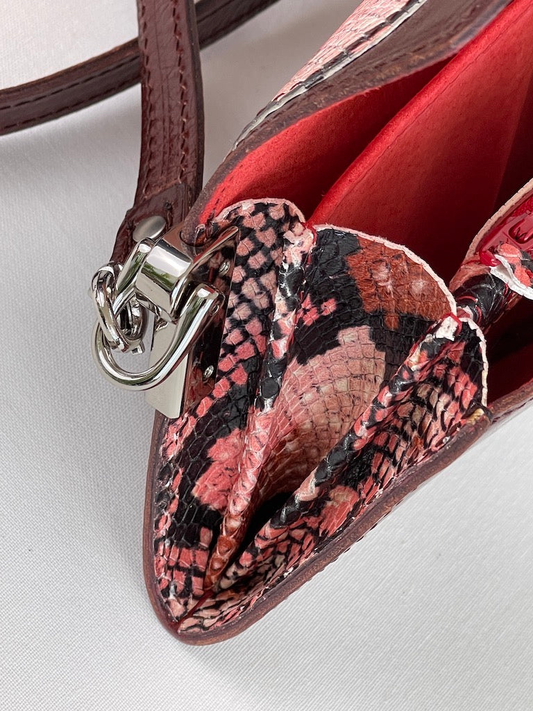 Coole uitstraling doordat het tasje een applicatie heeft van rood geitenleer met slangen print.