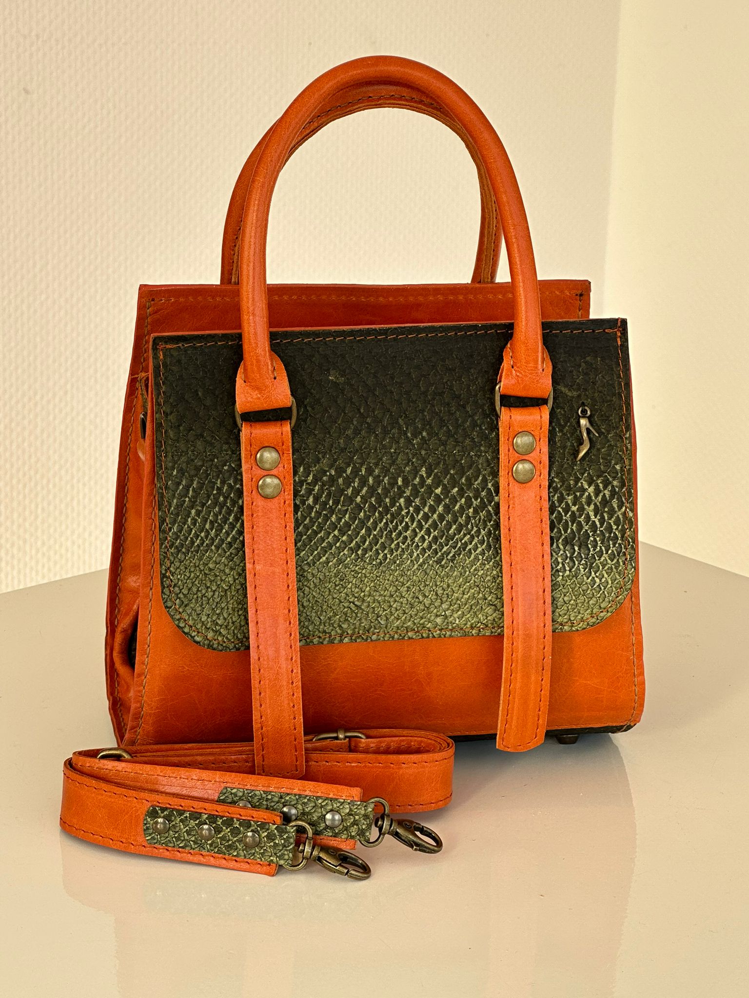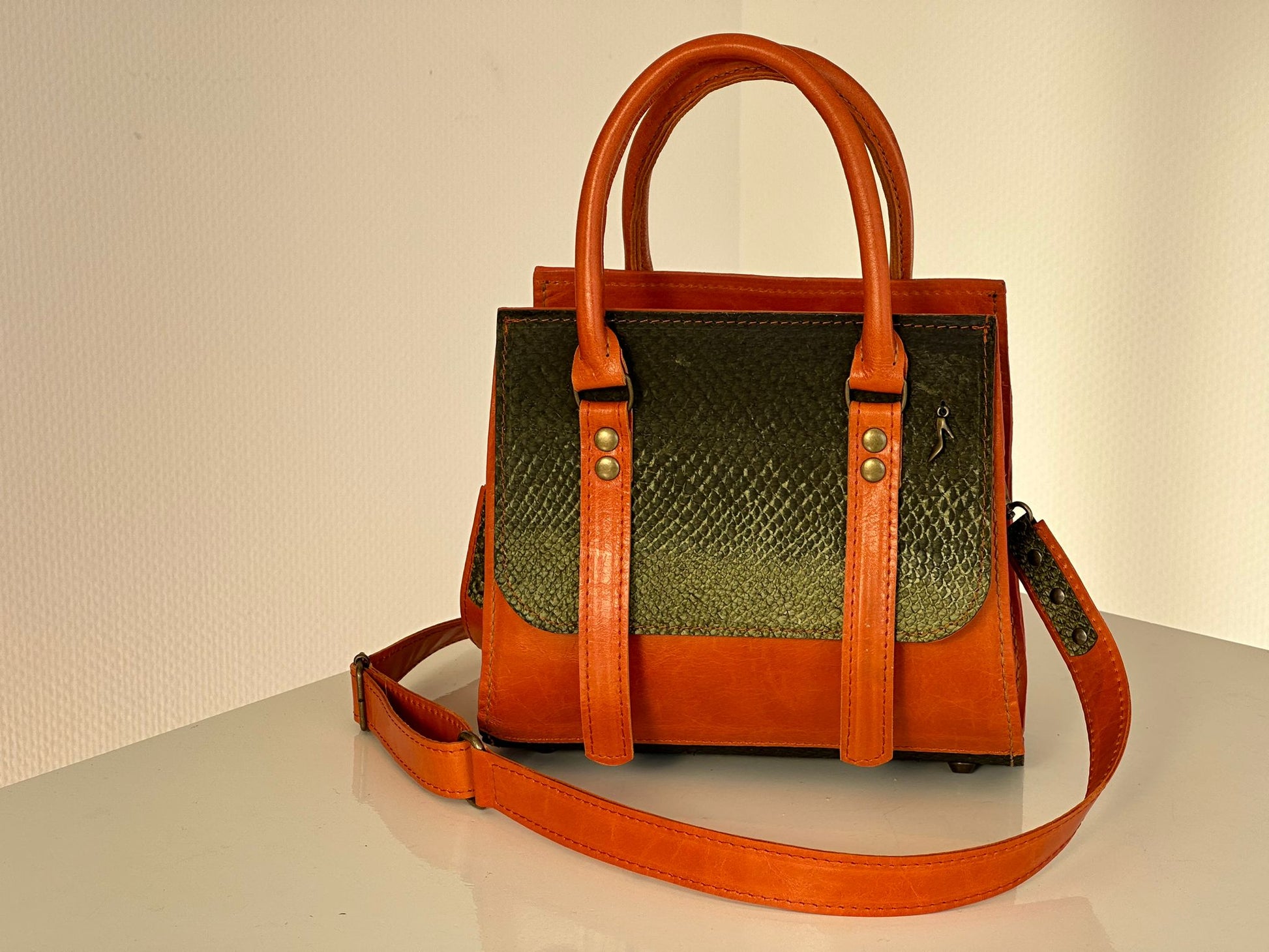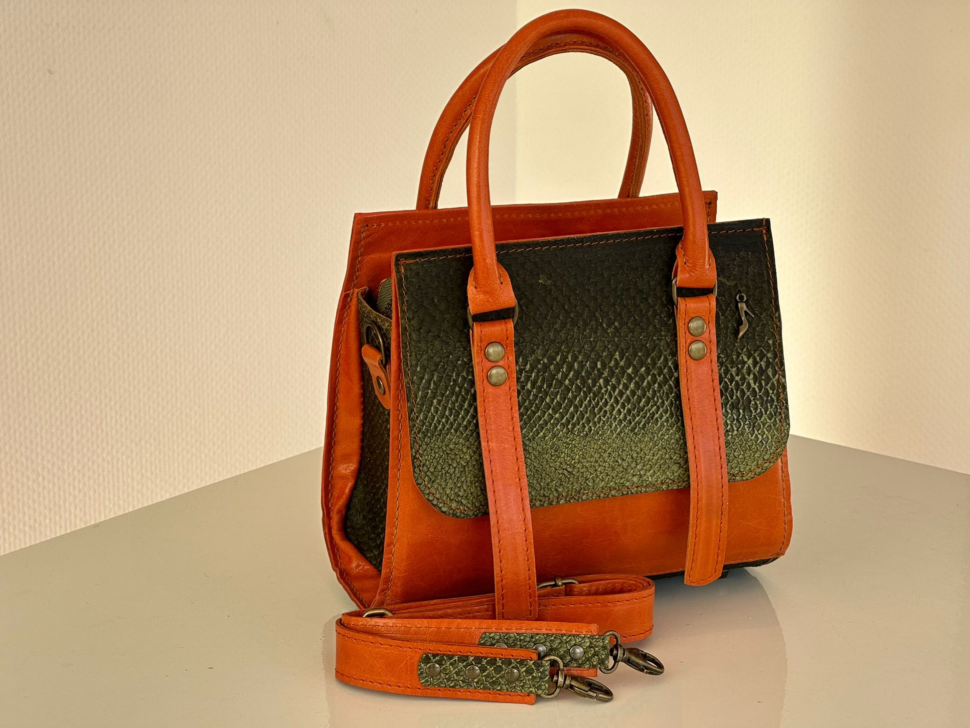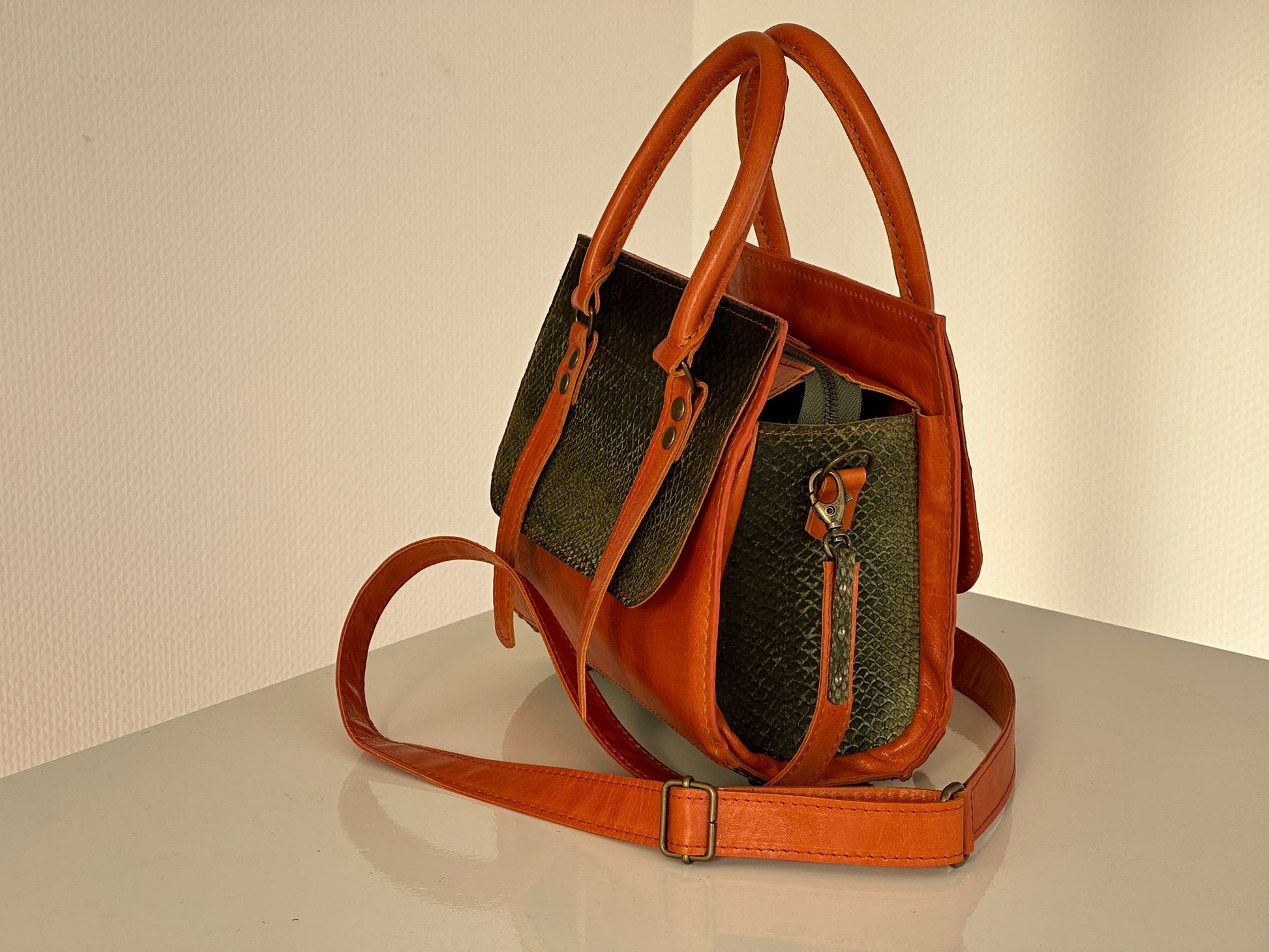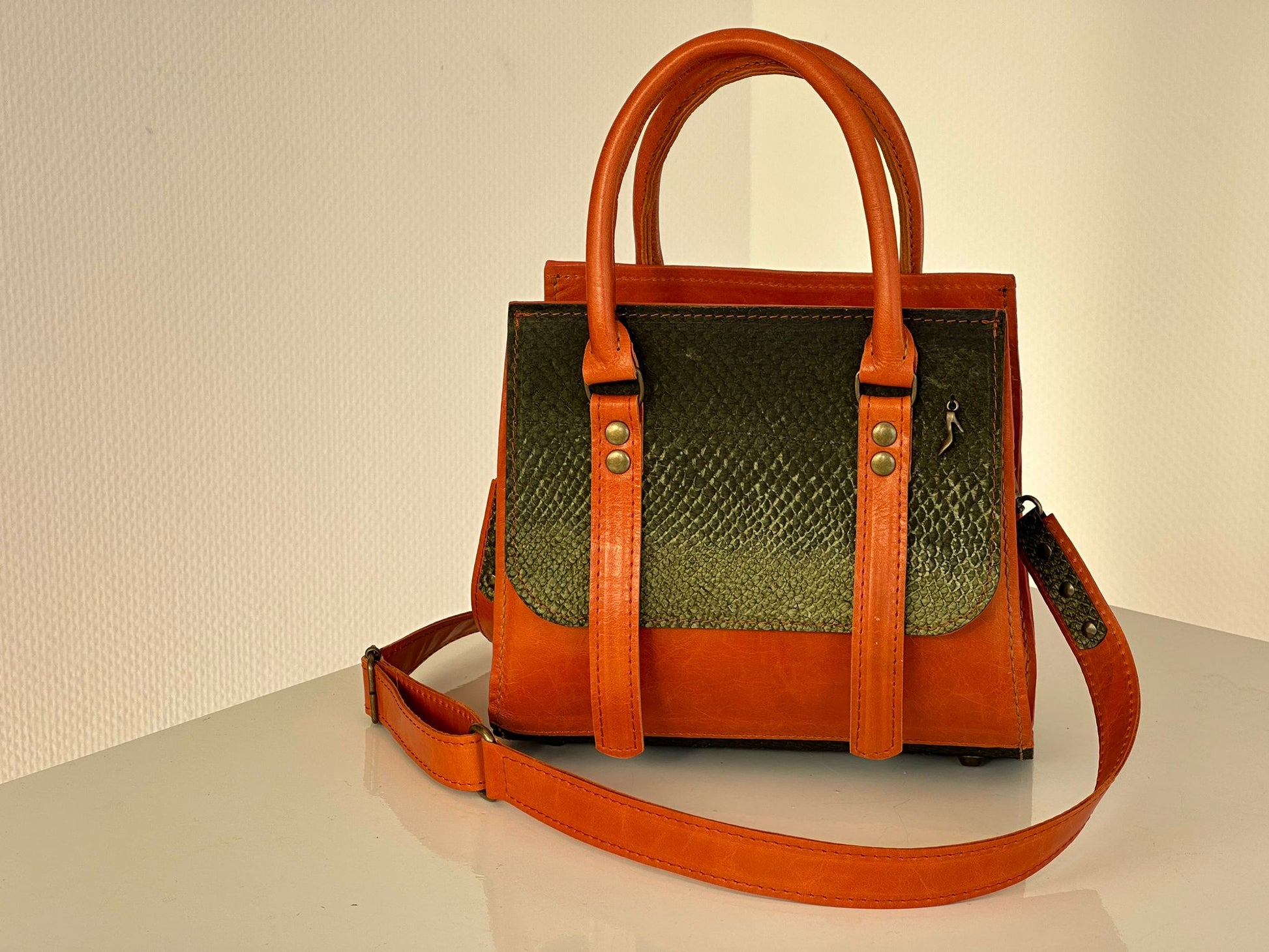Het leer, de ziel van deze tas, is niet zomaar leer. Deze tas is vervaardigd uit premium visleer, een materiaal dat bekend staat om zijn duurzaamheid en buitengewone schoonheid. Maar het mooiste is, met de tijd wordt deze tas alleen maar mooier en steviger. Het leer ontwikkelt een prachtige patina die een warme, rijke uitstraling geeft, als een fijne wijn die verbetert met de jaren.
