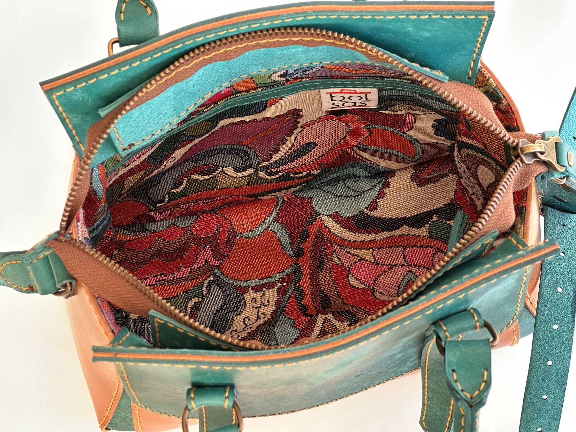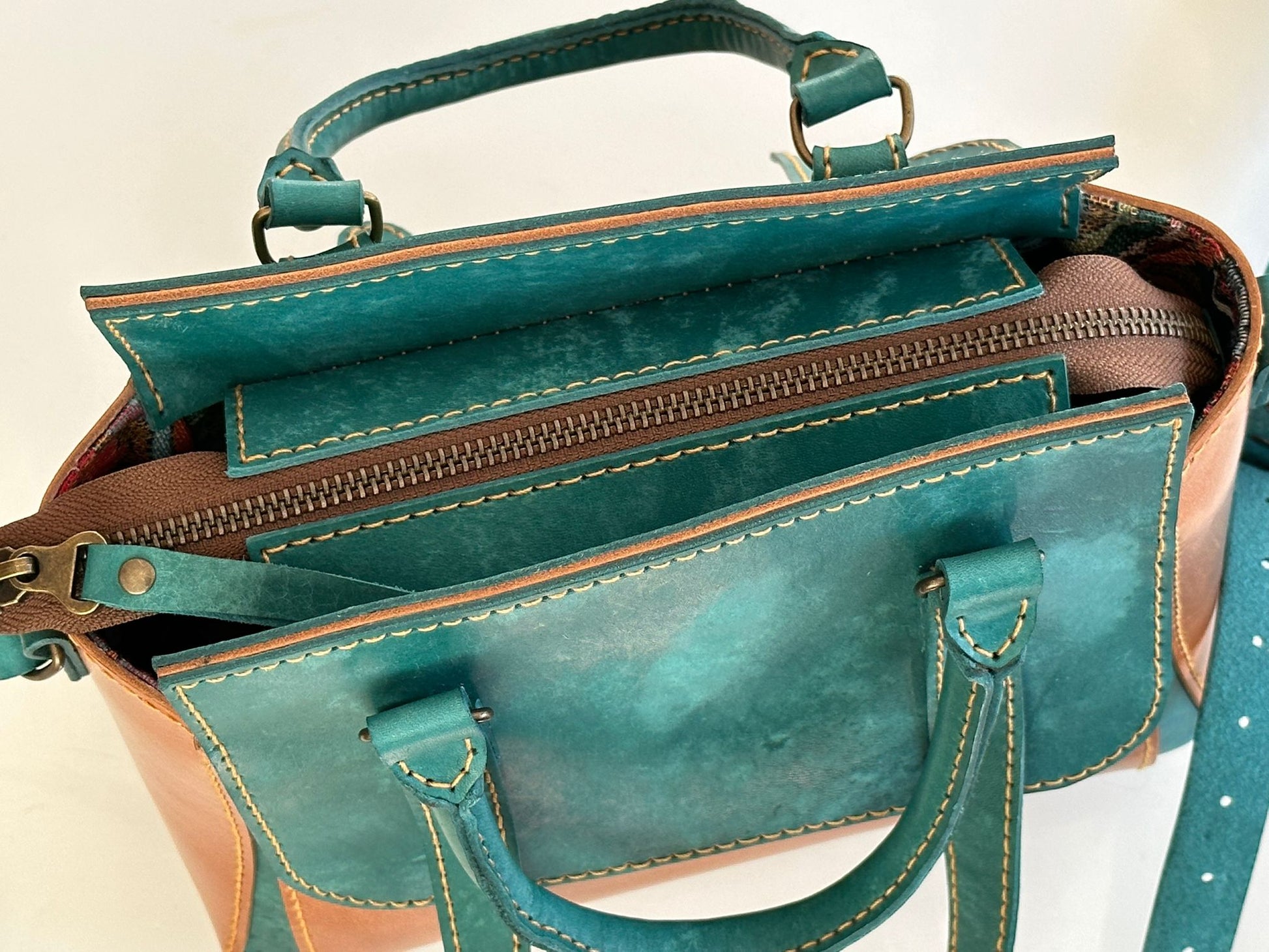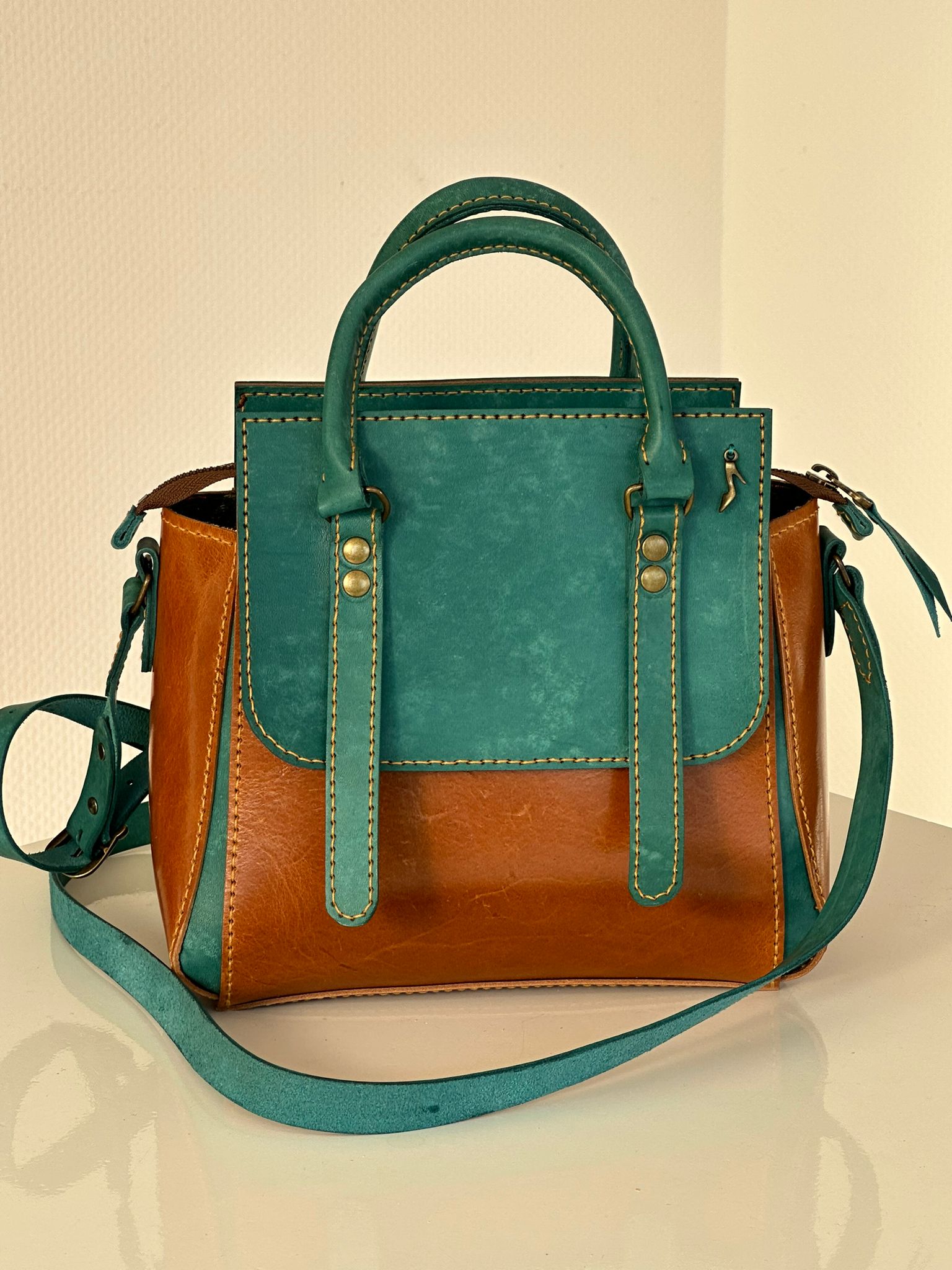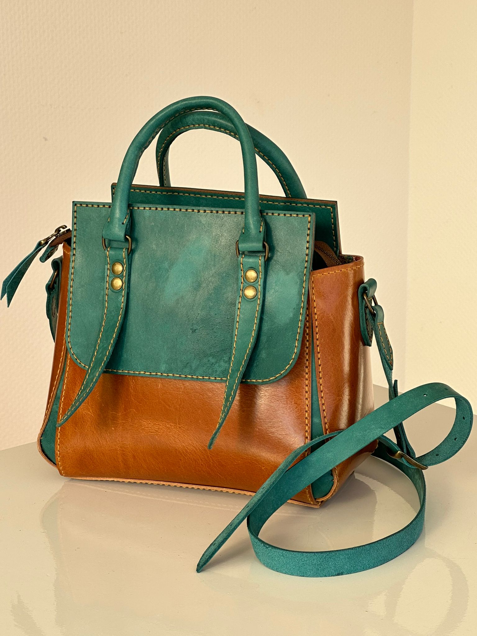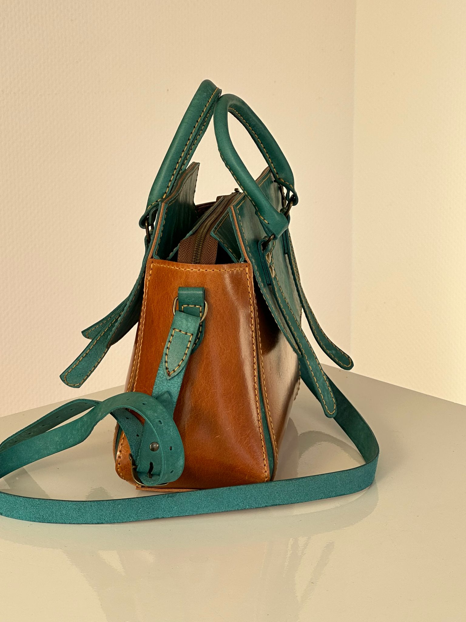 Wacht niet langer en voeg vandaag nog een vleugje luxe toe aan jouw leven met deze handgemaakte cognac leren tas met de prachtige blauwgroene handstiksels. Dit unieke accessoire wacht op jou!