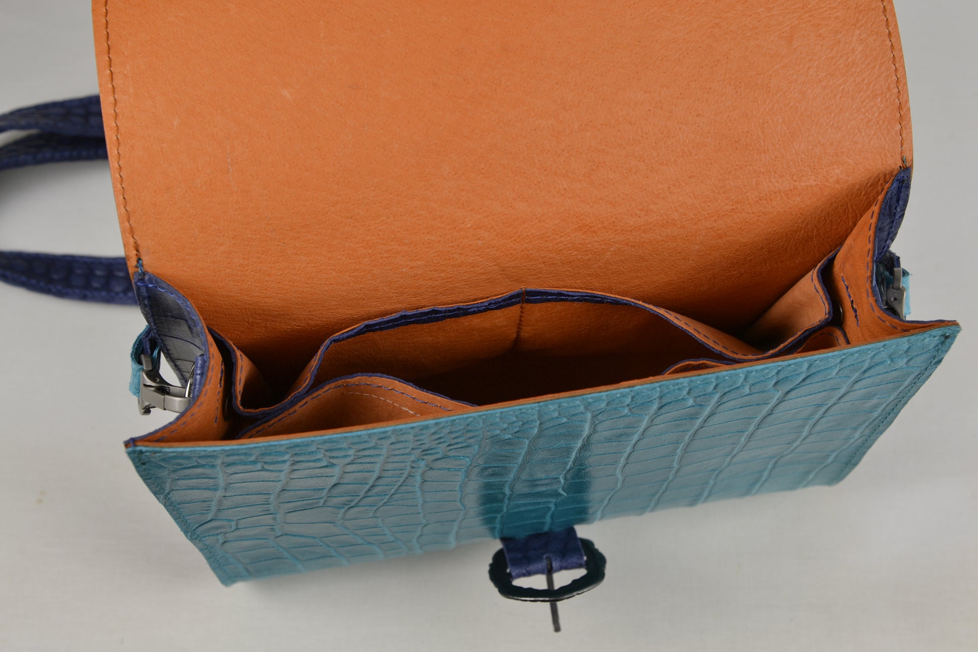 Flitsende schoudertas van turquoise rundleer met croco print. De croco print zorgt voor een prachtig reliëf. De band is van donkerblauw rundleer met print.
