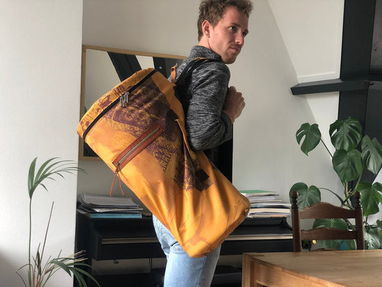Sander zocht een sterke tas om een "boomstam" te vervoeren. Want zo'n djembee is best zwaar. Of ik iets voor hem wist? Samen hebben we gezocht naar een sterk, waterdicht materiaal wat er ook nog leuk uitziet. Van museum Dokkum heb ik een banner gekregen van Bonefatius. Hoe leuk is het om Bonefatius te laten meereizen als bescherm heilige met een Friese muzikant met een Afikaans instrument? Naast een gebruiksvoorwerp komt er dan een (verstopte) spirituele betekenis bij. De tas is dubbel uitgevoerd met een grote rits aan de bovenkant en draagbanden die zowel enkel als dubbel gebruikt kunnen worden. En natuurlijk een extra vak voor wat lossen spullen die je mee wilt nemen.