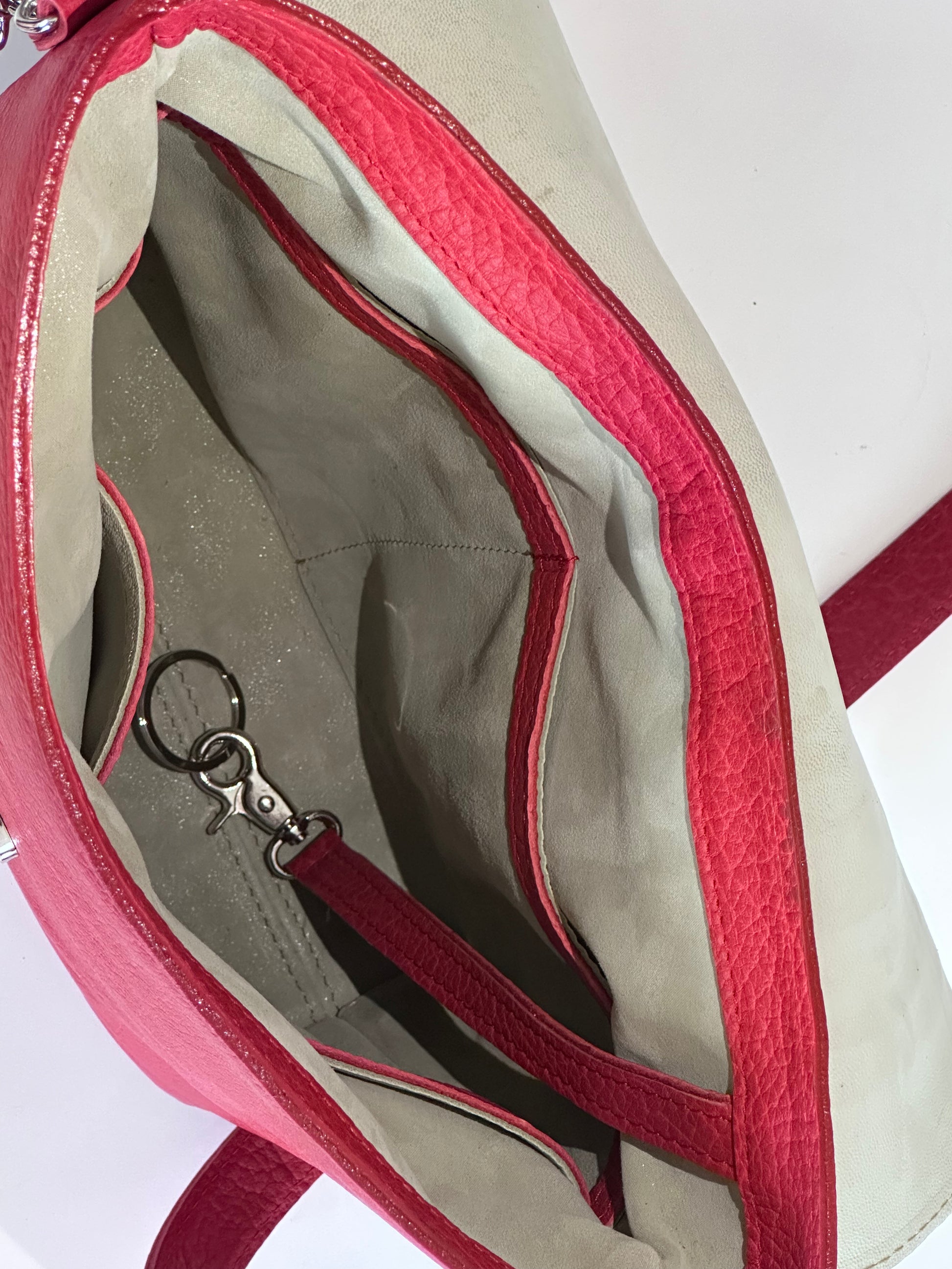 Else is een compacte shoulder bag, volledig handgemaakt uit robuust bisonleer. De combinatie van het diepe rood en de twee lichte contraststrepen geeft de tas een sportief-chique uitstraling. Een uniek one of a kind ontwerp, stevig, elegant en gemaakt voor dagelijks gebruik.